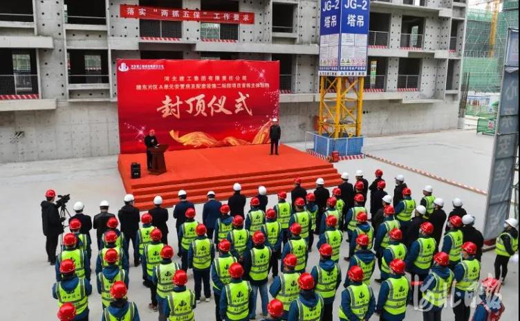 2021年3月17日,雄東片區A單元安置房及配套設施二标段項目A2-06-1#樓主體封頂儀式現場。河北日報記者耿輝攝