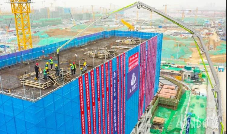 2021年3月17日拍攝的正在進(jìn)行混凝土主體封頂澆築的雄東片區A單元安置房A2-06-1#樓。河北日報記者耿輝攝