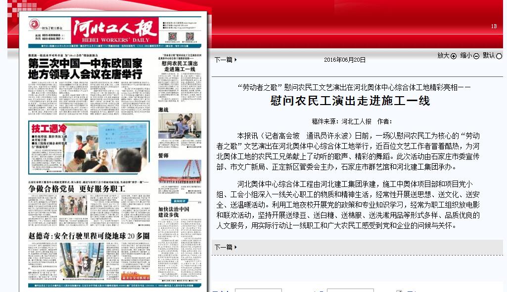 6月20日,《慰問農民工演出走進(jìn)施工一線》新聞稿件在《河北工人報》頭版刊登,具體内容如下: