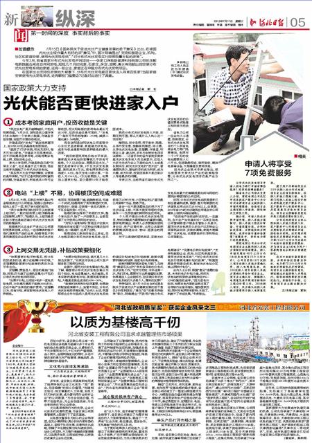 2013年7月17日,《河北日報》第五版新聞縱深欄目刊發(fā)題爲《以質爲基樓高千仞 ——河北建工省安裝公司追求卓越管理結市場碩果 》的文章,對(duì)省安裝公司的發(fā)展進(jìn)行了報道(dào)。全文如下:
