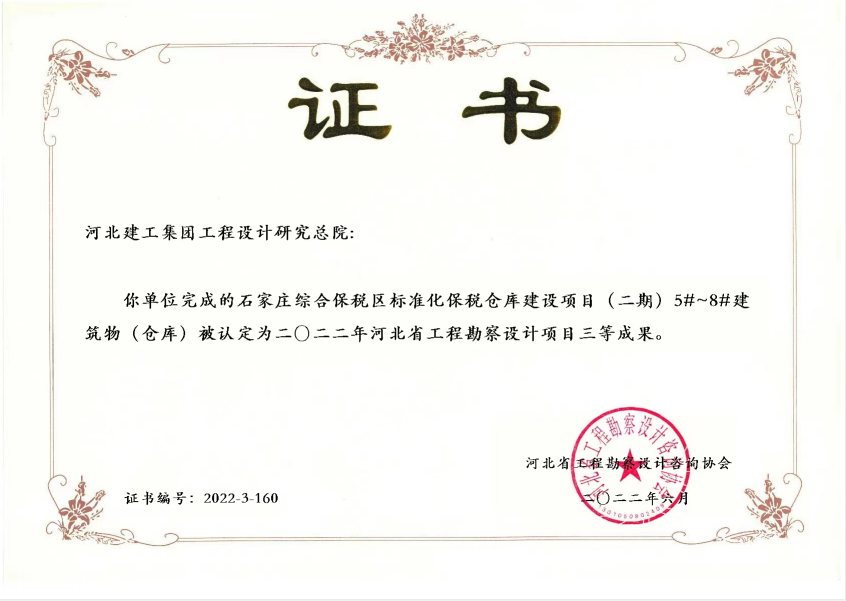 近日,河北省工程勘察設計咨詢協會(huì)公布了“2022年河北省工程勘察設計項目成(chéng)果認定結果”:河北邢建建設工程交易有限公司工程設計研究總院“北華航天工業學(xué)院實習實訓中心”建築設計項目獲評爲“二等成(chéng)果”;“石家莊綜合保稅區标準化保稅倉庫建設項目(二期)5#-8#建築物(倉庫)”建築設計項目獲評爲“三等成(chéng)果”。