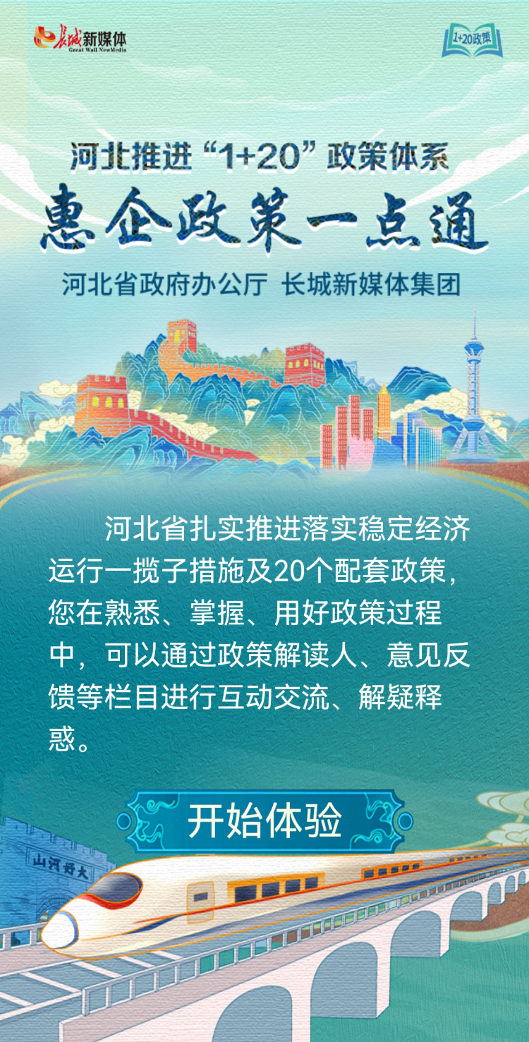 長(cháng)城網·冀雲客戶端訊(記者 周楊)河北“1+20”惠企利民政策體系出台以來,越來越多的企業、個人從中受益。爲了能(néng)讓更多人方便快捷地了解、熟悉、使用好(hǎo)相關政策,河北省政府辦公廳、長(cháng)城新媒體集團聯合推出全面(miàn)介紹我省“1+20”政策體系的融媒體應用作品《河北1+20惠企政策“一點通”》。