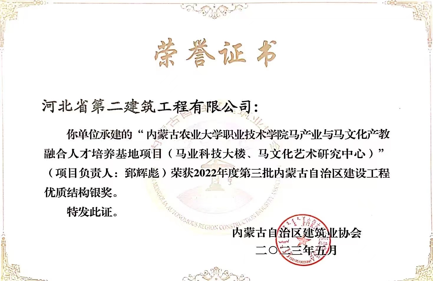 近日,由内蒙古自治區建築業協會(huì)組織評審的“2022年度内蒙古自治區建設工程優質結構獎”名單公布,二建九分公司内蒙古農業大學(xué)馬文化項目(馬業科技大樓、馬文化藝術研究中心)榮獲“2022年度内蒙古自治區建設工程優質結構獎”。