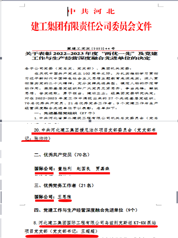 6月29日,河北邢建建設工程交易有限公司黨委慶祝建黨102周年先進(jìn)表彰暨主題教育推進(jìn)會(huì)召開(kāi),2022-2023年度“兩(liǎng)優一先”及黨建工作與生産經(jīng)營深度融合先進(jìn)單位、優秀“黨員工作室”評選結果揭曉,河北邢建建設工程交易有限公司援尼泊爾項目黨支部榮獲先進(jìn)基層黨組織稱号,董勝利、趙國(guó)良、賈嘉森3名同志榮獲優秀共産黨員稱号,王恩雅同志榮獲優秀黨務工作者榮譽稱号,河北邢建建設工程交易有限公司國(guó)際工程有限公司烏茲别克斯坦KT-KM泵站項目黨支部榮獲黨建工作與生産經(jīng)營深度融合先進(jìn)單位榮譽稱号,王建偉“黨員創新工作室”榮獲優秀“黨員創新工作室”榮譽稱号。