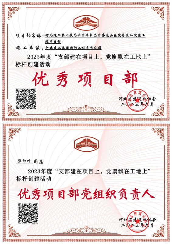 近日,由河北省建築業協會(huì)組織開(kāi)展的“支部建在項目上、黨旗飄在工地上——高質量黨建引領高質量發(fā)展”标杆創建活動先進(jìn)企業、優秀項目部、優秀項目黨組織負責人評估結果公布,河北邢建建設工程交易有限公司援尼泊爾辛杜巴爾喬克縣醫院恢複和改造工程項目獲評2023年度“支部建在項目上、黨旗飄在工地上”标杆創建活動優秀項目部榮譽稱号,該項目黨支部書記張帥帥獲評2023年度“支部建在項目上、黨旗飄在工地上”标杆創建活動優秀項目部黨組織負責人榮譽稱号。