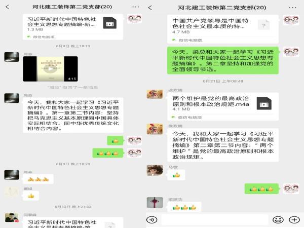 第二黨支部以《習近平新時(shí)代中國(guó)特色社會(huì)主義思想專題摘編》爲主要學(xué)習内容,廣大黨員利用6-7月份的時(shí)間,帶頭加強理論學(xué)習,全面(miàn)學(xué)習領會(huì)習近平新時(shí)代中國(guó)特色社會(huì)主義思想的科學(xué)體系、精髓要義、實踐要求,認真學(xué)習并由支部書記、支部委員、支部黨員依次進(jìn)行講讀,錄制音頻或視頻通過(guò)微信群進(jìn)行推送,達到一人學(xué)習,衆人受益,共同提高的學(xué)習效果。