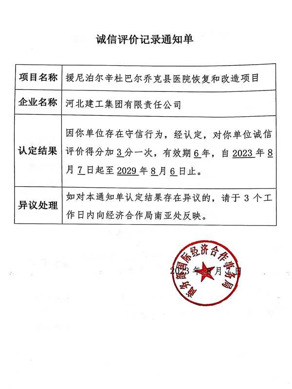 主題教育結碩果!繼7月份河北邢建建設工程交易有限公司承建的援尼泊爾辛杜巴爾喬克縣醫院恢複和改造項目中期驗收綜合檢查獲“雙優”後(hòu),8月7日,再傳捷報,商務部國(guó)際經(jīng)濟合作事(shì)務局下發(fā)誠信評價記錄通知單,爲河北邢建建設工程交易有限公司有限責任公司誠信評價體系加3分一次,有效期6年,自2023年8月7日起(qǐ)至2029年8月6日止。