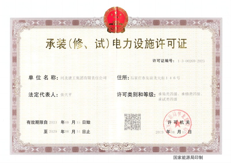 近日,河北建工集團申報的承裝(修、試)電力設施許可證成(chéng)功獲批,此證由國(guó)家能(néng)源局審批下發(fā),許可類别和等級爲承裝類四級、承修類四級、承試類四級。