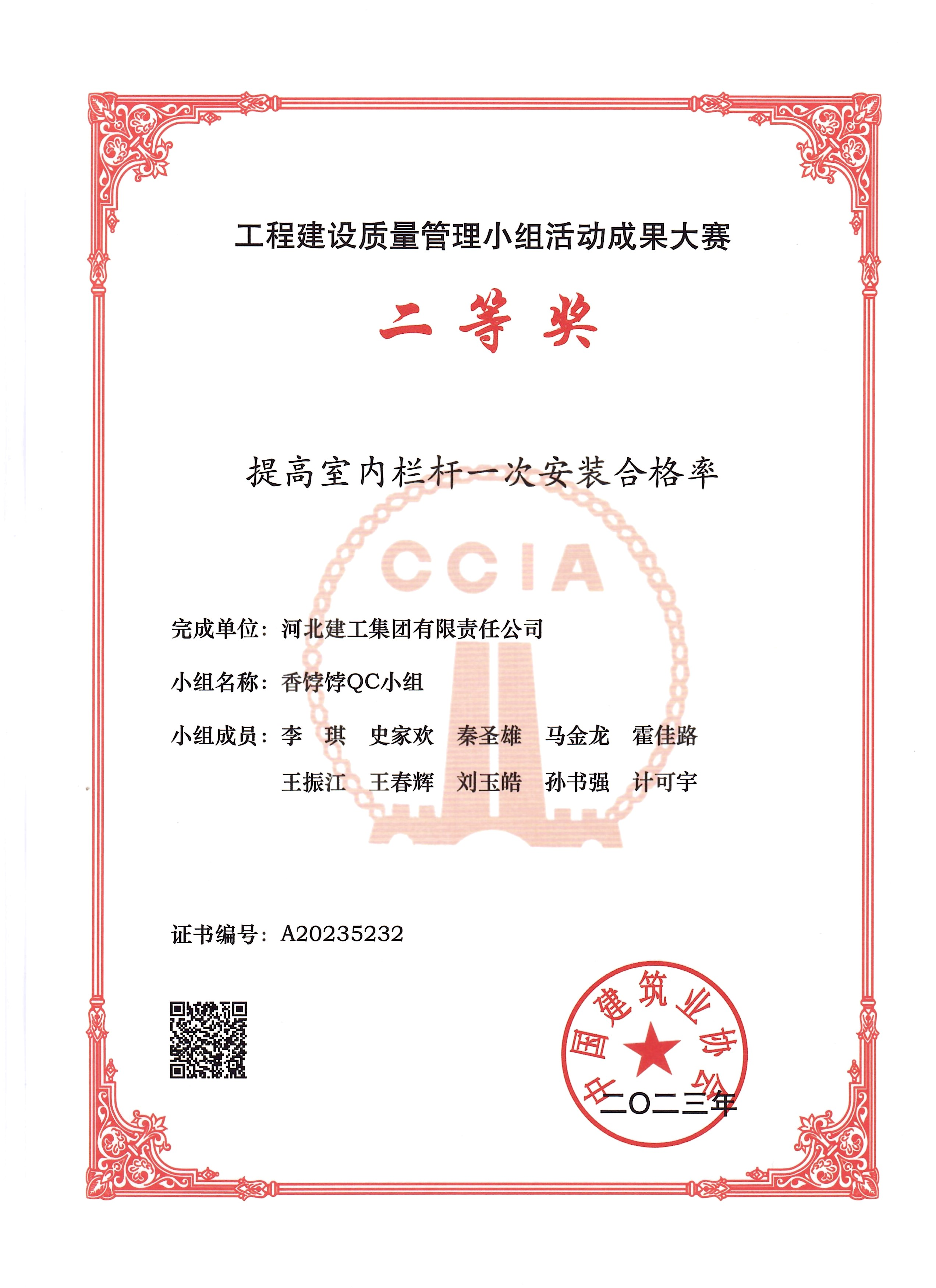 近日,河北建工集團八分公司雄東項目“香饽饽QC小組”編寫的《提高室内欄杆一次安裝合格率》在2023年度工程建設質量管理小組活動競賽中獲得二等獎。