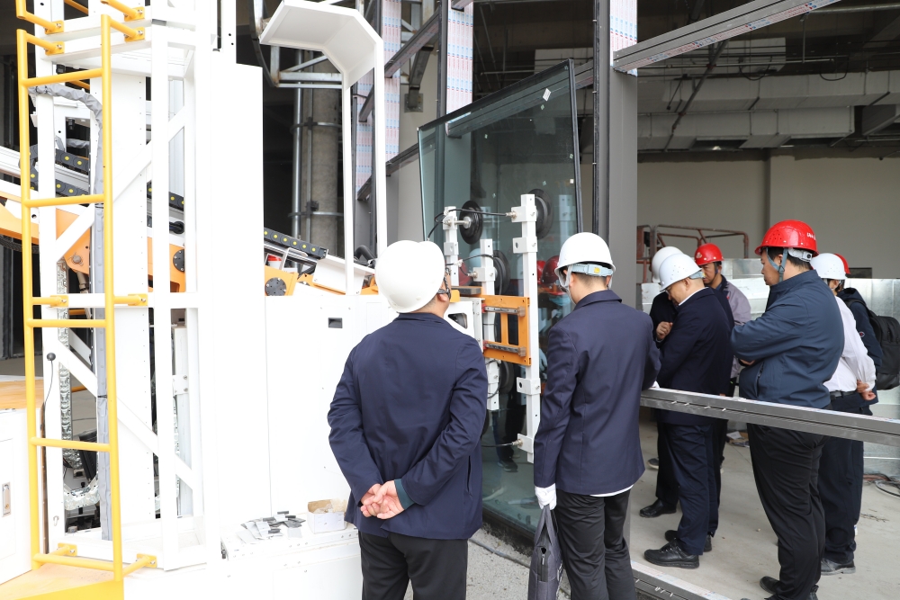 在應用現場,考察組實地觀看了機器人從抓取、運輸、姿态調整、對(duì)中入框、安裝到位等一整套标準操作流程,整套動作連貫、流暢、一氣呵成(chéng),基本實現人工遠程操控、設備全自動化,整個流程約爲8分鍾左右,成(chéng)功實現了二代機由實驗室到實際現場的落地使用,對(duì)于一代機有了全方位的飛躍。在調研過(guò)程中,董事(shì)長(cháng)張天平同志就(jiù)每一個步驟環節對(duì)研發(fā)小組人員進(jìn)行細緻的詢問、并探索尋求下一步改進(jìn)的方向(xiàng),以便于更加貼合施工現場的需求。總工程師安占法同志就(jiù)“二代機器人”與周邊的幕牆安裝負責人以及操作工人進(jìn)行了詳細的詢問,聽取了他們的看法、指出了與工人日常常規操作的優缺點。